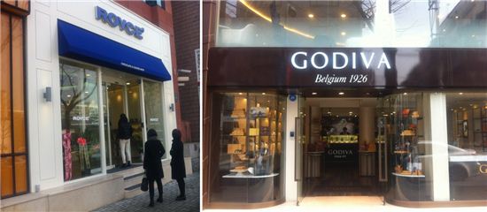 ▲압구정에 문을 연 로이즈 매장(왼쪽)과 가로수길에 문을 연 고디바 매장 전경. 로이즈 매장에 손님들이 제품을 구매하기 위해 들어가고 있다.
