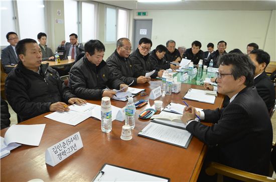 ▲권도엽 국토해양부 장관은 1일 오후 서울 양평동의 한 택시운수업체를 찾아 택시업계 종사자 15명의 의견을 듣고 정부의 택시지원법에 대해 설명했다.