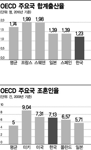 OECD 34개국 중 결혼은 3위, 출산은 꼴찌[아시아경제 김혜민 기자] 우리나라가 경제협력개발기구(OECD) 회원국 가운데 결혼율 대비 출산율이 가장 낮은 것으로 나타났다. 결혼은 많이 하지만 아기는 적게 낳는다는 얘기다. 이는 결혼을 늦게 하는 사람이 늘면서 여성이 첫 아이를 낳는 연령이 높아졌기 때문인 것으로 보인다. 육아부담도 출산율을 떨어뜨리는 데 한몫했다. 4일 OECD에 따르면 2009년 기준 우리나라의 인구 조혼인율은 7.13건으로 34개 회원국 중 3위를 차지했다. 조혼인율은 인구 1000명당 혼인건수 비율을 나타낸다. 반면 15~49세 여성이 평생 낳을 것으로 예상되는 자녀수의 기대값인 합계출산율은 2010년 1.23명에 그쳐 OECD 회원국 중 꼴찌였다.