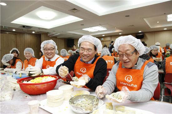 [아시아경제 임선태 기자]한화그룹(회장 김승연)은 4일 민족 대명절 설을 맞이해 계열사 최고경영자(CEO)들과 다음달 1일 정규직으로 전환되는 직원들이 함께 봉사활동을 펼쳤다고 밝혔다. 이번 봉사활동에는 신은철 한화생명보험 부회장, 홍원기 한화호텔앤드리조트 대표, 박석희 한화손해보험 대표, 김창범 한화L&C 대표, 박세훈 한화갤러리아 대표, 이율국 한화63시티 대표와 직원 150명 참여했다. 봉사단은 서울 중구 소재 유락종합사회복지관과 종로구 소재 종로노인종합복지관 등에서 직접 준비한 재료로 설음식을 만들고, 그 지역 독거노인 등 소외이웃들에게 전달하는 시간을 함께 했다.신은철 한화생명보험 대표는 "설을 맞이해 정규직 전환 직원들과 함께 어르신들을 찾아 뵙고 효를 실천할 수 있어서 더 의미 있었고, 전달해드린 사랑보다 받아온 사랑이 더 많은 소중한 시간이었다"고 말했다.한편 한화는 ‘함께 멀리’라는 사회공헌철학에 기반하여 전임직원이 하나 되어 기업의 사회적 책임을 다하고 있다. 이를 위해 한화는‘첫 출발은 사회봉사활동’이라는 모토아래 고졸사원에서부터 신임임원에 이르기까지 전 직급에 걸쳐 체계적, 지속적으로 사회공헌 봉사활동을 진행해오고 있다.임선태 기자 neojwalker@<ⓒ세계를 보는 창 경제를 보는 눈, 아시아경제(www.asiae.co.kr) 무단전재 배포금지>