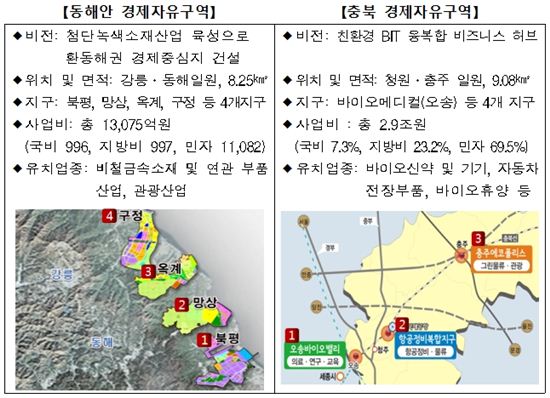 [아시아경제 김혜원 기자] 동해안(강원)과 충북이 경제자유구역으로 추가 지정됐다.지식경제부는 4일 제56차 경제자유구역위원회를 열고 동해안과 충북 지역을 경제자유구역으로 공식 지정하는 내용의 '경제자유구역 추가지정(안)'을 심의ㆍ의결했다고 밝혔다.지난해 9월 동해안과 충북을 후보 지역으로 선정한 지경부는 본 지정을 앞두고 국토해양부, 환경부, 농림수산식품부, 산림청 등 관계 부처와 협의를 진행해 왔다.관계 부처 협의를 거치는 과정에서 면적과 사업비 등이 일부 조정됐다.동해안 경제자유구역은 면적이 8.61㎢에서 8.25㎢(옥계지구 축소)로 줄었다. 사업비는 단지조성비 산출단가 조정으로 기존 1조509억원에서 1조3075억원으로 늘었다.충북은 10.77㎢의 면적이 9.13㎢로 축소됐으며 사업비는 2조2775억원에서 1조9942억원으로 줄었다.동해안 경제자유구역은 첨단소재(비철금속), 충북 경제자유구역은 친환경 BIT(바이오+정보기술) 융복합 산업을 집중 육성할 계획이다.이날 위원회에 참석한 최문순 강원도지사와 이시종 충북도지사는 경제자유구역 지정에 따른 경제적 파급효과로 생산 유발 총 17조2000억원(동해안 13조원ㆍ충북 4조2000억원), 부가가치 유발(동해안 4조8000억원ㆍ충북 1조6000억원), 고용 유발 총 8만3000명(동해안 5만3000명ㆍ충북 3만명) 등이 기대된다고 전망했다.