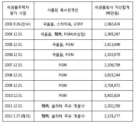 론스타의 외환은행 지배 기간 중 비금융주력자 입증 일람표<br />