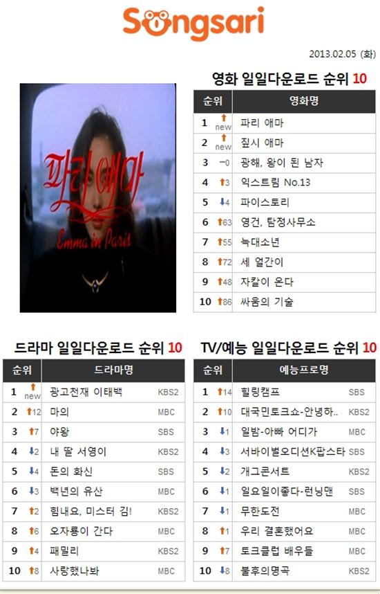 [아시아경제 최준용 기자]웹하드 송사리는 "영화 '애마부인 시리즈'가 다운로드 순위 1, 2위를 차지했다"고 전했다. 1988년 개봉 된 영화 ‘파리 애마’는 애마부인 1편을 제작한 정인엽 감독의 작품으로 배우 유혜리가 출연하여 영화의 성공과 더불어 배우 유혜리를 스타로 자리매김 해준 작품이다. 애마부인 시리즈를 잇는 '짚시 애마'도 함께 2위에 오르며 80년대 후반의 원조 에로영화 작품들이 순위권을 장악했다. 웹하드 송사리는 "갑자기 '애마부인 시리즈'가 급상승한 이유는 4일 방송된 MBC '토크클럽 배우들' 프로그램에 원조 섹시 여배우 3인방으로 출연하게 되면서 급기야 포털 사이트 실시간 검색어에 오르게 돼 그녀들의 작품들까지 온라인을 후끈 달구고 있는 것 같다"고 전했다. 그밖에 순위차트에는 오르지 못하였지만 양약수술 이후의 최근 모습이 화제가 되면서 윤현숙의 출연작 '싸움의 기술'과 영화배우로 전업하며 다재다능한 모습을 보이고 있는 최송현의 첫 주연 작 ‘영건 탐정사무소’ , 그리고 예능에서도 두각을 보이고 있는 송지효가 주연한 '자칼이 온다' 가 순위에 진입하는 현상을 보였다. 드라마 부문은 4일 첫방송 된 새 월화드라마 KBS2 '광고천재 이태백'이 1위를 차지했다. 실존인물 이제석 광고 디자이너를 모티브로 창작한 작품으로 그림에 타고난 재능을 가진 통영 출신 이태백이 서울에서 성공하는 스토리는 그린 드라마이다. 본방 사수를 놓친 네티즌들이 다운로드 서비스를 통해 빠르게 접하고 있다. 첫 회 시청률은 저조했지만 광고라는 신선한 소재와 배우들의 호연으로 향후 전개에 대한 기대를 높였다. 2위는 동시간대 시청률 1위를 기록한 MBC '마의'가 차지했으며, 3위 역시도 SBS '야왕'이 랭크 됐다.예능 부문은 SBS '힐링캠프'가 차지했다. 대한민국 커밍아웃 1호 방송인 홍석천이 출연하면서 그를 통해 성소수자의 아픔과 눈물, 그의 진정성 있는 솔직한 이야기에 시청자들도 함께 소통한 힐링의 진면목을 보여줬다. 그 뒤로 2위는 KBS2 '대국민토크쇼-안녕하세요'가 차지했다. 월요일 심야 예능프로그램 1위 자리를 고수했지만 '힐링캠프' 홍석천의 커밍아웃과 관련된 솔직한 이야기에 뒤지고 말았다. 3위는 MBC '일밤- 아빠 어디가'가 천진난만한 귀여운 아이들의 순수한 모습에 시청률이 급등하며 온라인상에서도 많은 인기를 얻고 있다.최준용 기자 cjy@<ⓒ아시아경제 & 스투닷컴(stoo.com)이 만드는 온오프라인 연예뉴스>