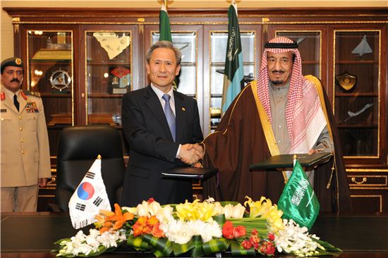 김관진 국방장관(왼편)과 살만 빈 압둘 아지즈 사우디아라비아 왕세제 겸 국방장관이 양국간 국방방산교류협정에 서명한 후 악수하고 있다.