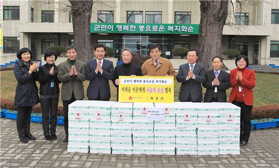 한돈협회 화순지부(지부장 임중기)는 설 명절을 앞두고 지난 5일 주변의 어려운 이웃들을 돌아보고 나눔 분위기를 확산시키고자 500만원(한돈자조금) 어치의 ‘한돈 희망돼지고기’ 150박스를 화순군에 기부했다.이날 화순군청 앞 광장에서 김연태 부군수를 비롯해 허길중 주민복지과장, 권석주 농업정책과장, 임중기 한돈협회화순지부장 등이 참석한 가운데 전달식을 가졌다.임중기 한돈협회 화순지부장은 “온 가족이 함께 따뜻한 온기를 나눠야 할 명절에 사회적으로 소외된 이웃들에게 적으나마 따뜻함을 나눌 수 있도록 한돈 희망돼지고기를 전달하게 됐다”고 말했다.그는 또 “소외된 이웃은 물론 저돈가 문제로 어려움을 겪고 있는 한돈 농가들에도 용기와 희망을 갖도록 한돈의 소비 촉진을 당부한다”고 덧붙였다.김영균 기자<ⓒ세계를 보는 창 경제를 보는 눈, 아시아경제(www.asiae.co.kr) 무단전재 배포금지>