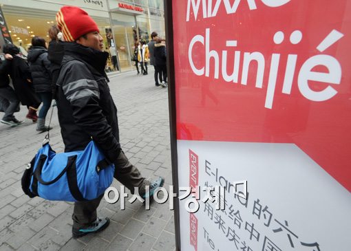 [아시아경제 백소아 기자] 6일 서울 명동 쇼핑거리에는 중국 관광객을 맞을 준비가 한창이다. 한국관광공사는 춘제 기간 동안 중국인 관광객이 작년보다 25% 증가한 6만 3,000명에 달할 것으로 예상했다.백소아 기자 sharp2046@<ⓒ세계를 보는 창 경제를 보는 눈, 아시아경제(www.asiae.co.kr) 무단전재 배포금지>