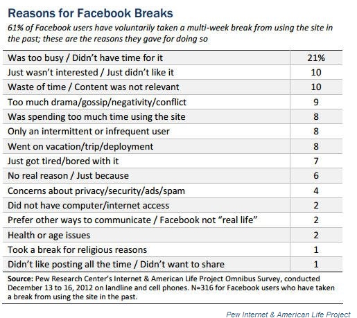 [아시아경제 조유진 기자]미국 페이스북 사용자의 60% 이상이 지난 몇 주간 페이스북 활동을 중단한 것으로 조사됐다. 자체 소셜검색 서비스 '그래프 서치'의 정식 출시 앞두고 탄력을 받아야 할 시기에 사용자 감소를 우려하게 됐다. 7일(현지시간) 미국 경제 격주간지 포브스 온라인판에 따르면 페이스북 사용자의 60%가 시간 낭비와 흥미 상실 등을 이유로 지난 몇 주 동안 페이스북 활동을 잠정 중단하고 있는 것으로 나타났다. 미국 여론조사기관인 퓨 리서치가 지난해 12월 18세 이상의 미국인 성인 1006명을 대상으로 자체 조사를 실시한 결과, 페이스북이 기존 사용자 이탈과 신규 사용자 유입 감소를 경험하고 있는 것으로 나타났다. 페이스북 활동을 중단한 사유는 '너무 바빠서'가 전체 응답자의 22%로 가장 많았고, '흥미를 잃어서, 시간 낭비라고 생각해서(10%) '불필요한 가십만 넘쳐서, 페친(페이스북 친구)와의 갈등으로(9%) '불필요하게 시간을 낭비하고 있다고 생각해서(8%)' 등이 뒤를 이었다. 기타 사유로는 '친구들의 지적과 조언에서 잠시 떠나 있고 싶어서', '뉴스피드 대신 전화로 친구 안부를 확인하고 싶어서' '잠시 활동을 중단하고 씽씽한 글로 다시 돌아오려고' 등이 있다. 또한 미국 성인 온라인 사용자 가운데 20%가 페이스북을 한 번 이상 경험해 봤지만 지속적으로 활동할 계획은 전혀 없다고 답했다. 신규 이용자 유입 감소가 우려되는 대목이다. 전체 응답자의 27%는 올해 페이스북 활동 시간을 줄여나가겠다고 답했고, 페이스북 활동 시간을 늘리겠다는 응답자는 3%에 그쳤다. 페이스북은 현재 미국 소셜 미디어 부분에서는 링크드인과 트위터를 제치고 점유율 1위를 달리고 있다.