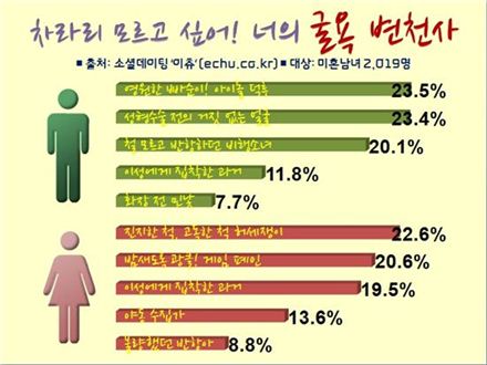남성을 대상으로 ‘여성에게 들키고 싶지 않은 자신의 변천사’에 대해 조사한 결과, ‘촌티가 줄줄 흐르는 어설픈 옷차림’을 선택한 응답자가 43.5%로 가장 많았다. 이어서 ▲살 빠지기 전 투실투실한 모습(13.2%) ▲밤새도록 광클, 게임폐인(10.1%) ▲이성에게 울고 불고 집착했던 찌질이(9.6%)라고 답한 남성의 비율도 높았다. 여성 33.4%는 ‘남성에게 들키고 싶지 않은 변천사’ 1위로 ‘살 빠지기 전 투실투실한 모습’을 선택했다. ‘촌티가 줄줄 흐르는 어설픈 옷차림’(22.9%)이 그 뒤를 이었으며 ▲화장술을 깨닫기 전의 정직한 민낯(16.4%)과 ▲성형수술 전의 거짓 없는 얼굴(9%)을 선택한 응답자도 두드러졌다.그렇다면 실제로 이성이 생각하는 최악의 변천사는 무엇일까? 남성은 ‘호감 여성의 변천사 중 가장 최악인 변천사’를 묻는 질문에 ‘아이돌 꽁무니를 쫓아다녔던 아이돌 덕후’(23.5%)를 최악의 변천사로 꼽았다. ‘성형수술 전의 거짓 없는 얼굴’(23.4%)은 근소한 차이로 그 뒤를 이었으며 ‘철 모르고 반항하던 비행소녀’(20.1%)의 모습을 최악의 변천사라 생각하는 남성 또한 많았다. 그 밖에도 남성은 ‘이성에게 울고 불고 집착했던 찌질이’(11.8%), ‘화장술을 깨닫기 전의 정직한 민낯’(7.7%), ‘촌티가 줄줄 흐르는 어설픈 옷차림’(5.4%) 등을 최악의 이성 변천사로 꼽았다.반면 여성은 ‘진지한 척, 고독한 척 허세쟁이’(22.6%)를 가장 최악의 옛 시절이라고 생각했다. 또한 여성 응답자는 ‘밤새도록 광클, 게임 폐인’(20.6%)을 최악의 변천사 2위로 꼽았고, ‘이성에게 울고 불고 집착했던 찌질이’(19.5%)라는 답변도 높은 비율을 보였다.기타 의견으로는 ▲야동 수집가(13.6%), ▲철 없이 주먹 쓰던 불량소년(8.8%), ▲촌티가 줄줄 흐르는 어설픈 옷차림(7.1%) 등이 집계됐다.그러나 ‘호감이성의 굴욕적인 변천사를 알게 된 이후의 반응’에 대해서는 남녀 모두 너그러운 태도를 보였다. 전체 86.6%(남 87.2%, 여 85.9%)가 굴욕적인 변천사를 알고 난 이후에도 ‘애정은 변함 없다’고 답한 것이다. ‘애정이 식을 것 같다’고 답한 응답자는 13.4%(남 12.8%, 여 14.1%)로 비교적 낮았다.김동원 이츄 팀장은 “남녀 응답자 모두 스스로 굴욕적이라고 선택한 항목은 외모에관한 것이었지만 실제 상대 이성이 실망감을 느끼는 부분은 내면에 대한 항목이다”라며 “촌스러웠던 과거 모습을 부끄러워하기보다 건강한 내면을 자신의 매력으로 삼으면 좋을 것”이라고 조언했다. 오주연 기자 moon170@<ⓒ세계를 보는 창 경제를 보는 눈, 아시아경제(www.asiae.co.kr) 무단전재 배포금지>