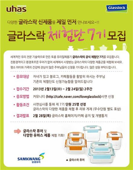 [아시아경제 김대섭 기자] 종합주방생활용품기업 삼광유리가 유리밀폐용기 '글라스락' 공식 체험단 7기를 모집한다. 이번 체험단 모집 기간은 오는 24일까지다. 공식 커뮤니티(cafe.naver.com/iloveglasslock)에서 '글라스락 체험단 지원 동기' 응모를 통해 신청하면 된다. 심사를 통해 25명을 선정할 예정이다. 체험단원들은 총 4주 동안 삼광유리에서 최근 출시한 프리미엄 유리밀폐용기 글라스락 퓨어와 다양한 신제품을 직접 사용하며 체험 미션을 수행하게 된다. 활동 우수 체험단원에게는 제품 증정과 함께 추가 혜택도 제공한다. 체험단원 선정결과는 오는 28일 삼광유리 홈페이지(www.glasslock.co.kr)와 공식 커뮤니티를 통해 발표한다. 김대섭 기자 joas11@<ⓒ세계를 보는 창 경제를 보는 눈, 아시아경제(www.asiae.co.kr) 무단전재 배포금지>