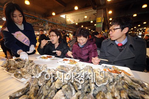[아시아경제 백소아 기자] 15일 서울 노량진수산시장에서 수협중앙회 주최로 열린 수산물소비촉진행사에 참석한 시민들이 굴을 시식하고 있다. 수협은 최근 굴 등에서 노로바이러스가 검출됐다는 소식에 수산업이 위축되고 있으며 우리나라 수산물은 안전하다고 밝혔다.백소아 기자 sharp2046@<ⓒ세계를 보는 창 경제를 보는 눈, 아시아경제(www.asiae.co.kr) 무단전재 배포금지>