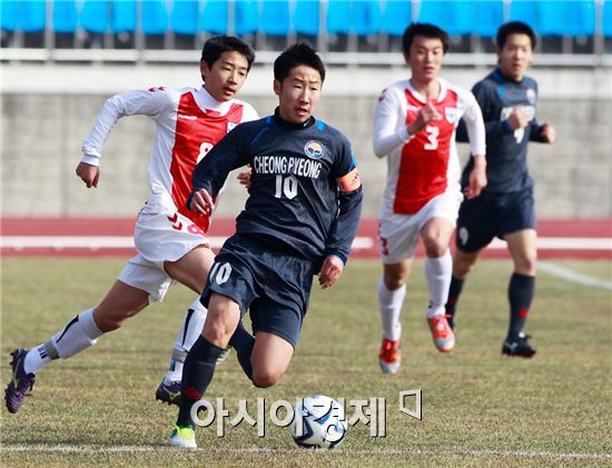 15일 광양시 공설운동장에 열린 대구 대륜고 VS 경기 청평고의 개막전 경기에서 청평고 선수가 볼을 드리볼 하고 있다.