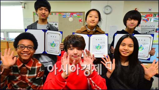 황군은 "제 피부색을 보며 사람들이 수근거릴 때마다 힘든 적도 많았고 울기도 많이 울었어요. 하지만 지금은 좋은 친구들과 함께 미래를 꿈꿀 수 있어 행복해요"며 어른스럽게 답했다. 영화배우가 꿈이라는 그의 롤모델은 헐리우드 배우 윌 스미스다. "배우가 꿈이지만 공부도 열심히 하겠다"고 말하는 그에게서 구김살을 찾기란 어려웠다.또렷한 이목구비로 시선을 끄는 전미나(14)양은 아직 한국말이 익숙치 않다. "친구들, 선생님들과 헤어지니까 조금은 슬프다"며 수줍게 웃고 만다. 피아니스트가 꿈인 전양은 필리핀 엄마와 한국인 아빠 사이에서 태어났다. 이날 졸업식에 함께 참석한 전양의 어머니는 "지난 98년에 결혼해 세 자녀를 낳았다. 한국에 온지는 2년이 채 안됐지만 아이가 적응을 잘하고 이번에 졸업도 하게 돼 기쁘다"고 말했다.케일렙군의 소감도 인상적이다. 선교사로 활동 중인 영국인 아빠와 한국인 엄마 사이에서 태어난 그는 영국의 축구선수 루니를 좋아하는 내성적인 소년이다. 평소 책 읽는 것을 좋아하고 점잖은 성격을 지녔다. 그는 "2007년 부모님과 함께 영국을 방문했던 게 좋은 기억으로 남아 있다"며 "그곳에선 아무도 내 외모에 주목하지 않아 마음이 편했다"고 털어놨다.안우성·손건성군과 이지혜양은 중국 출신의 이주민 가정 자녀들이다. 개구쟁이 같은 외모로 "프로게이머가 되고 싶다"고 말하는 우성군, "한국 생활에 만족하고 있다"고 말하는 건성군은 인기 아이돌그룹에 열광하는 평범한 소년들이다. 2년 전 한국에 오게 된 지혜양 역시 "걸그룹 '에이핑크'를 좋아한다"며 해맑게 웃었다. 아이들을 지켜 보던 이윤주 담임교사는 "참 유쾌한 아이들"이라며 함박웃음을 지었다.지구촌학교는 이주민지원 전문기관인 사단법인 지구촌사랑나눔 대표 김해성 목사가 지난 2011년 3월 설립해 같은해 11월 국내 최초 정규 초등 대안학교로 인가받았다. 현재 중국, 필리핀, 미얀마, 일본, 태국, 과테말라, 우즈벡, 미국 등 16개국 출신 98명이 재학 중이다. 박세진 교장은 이날 졸업생 및 내빈들을 향해 "다문화 가정의 자녀들은 부모의 어려운 경제사정이나 학교부적응, 학습부진 문제로 학업을 중단하거나 포기하는 사례가 많다. 이번 졸업식이 첫 시금석이 돼 이들이 한국 사회의 전문 인력으로 건강하게 성장하길 바란다"고 전했다.학교 설립자인 김해성 목사는 축사를 통해 "이들 6명은 평범한 졸업생이 아니라 왕따와 차별 등 갖가지 역경을 이겨낸 영웅들"이라고 평한 뒤, 졸업생들에게 "다문화 희망세상을 일구는 주역이 되어 달라"고 당부했다.통계청에 따르면 국내 다문화 가정 자녀수는 지난 2010년 12만명에서 해마다 2만명씩 늘고 있다. 숫자는 증가한 반면 이들의 중학교 미진학율은 전체의 59.2%, 고등학교 미진학율은 81.1%에 달한다. 또 학업이 중단된 후에도 별다른 지원도 못받은 채 방치되는 경우가 많다. 지구촌사랑나눔의 이원재 후원팀장은 "현재 150만에 육박하는 다문화 가정의 교육 및 문화적응 문제를 계속 방치하면 우리 사회의 불안 요인이 그만큼 확대될 수 밖에 없다"고 강조했다. 그는 "이들이 한국 사회의 구성원으로서 함께 살아갈 수 있도록 지속적인 교육지원 및 다문화 출신에 대한 인식 개선이 필요하다"고 덧붙였다.장인서 기자 en1302@<ⓒ세계를 보는 창 경제를 보는 눈, 아시아경제(www.asiae.co.kr) 무단전재 배포금지>