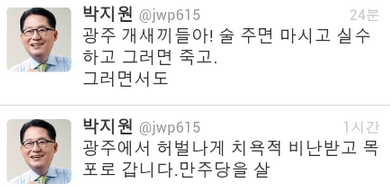 [아시아경제 박충훈 기자] 박지원 민주통합당 의원(전남 목포)이 트위터에 광주시민들에 대한 욕설을 올린 것에 대해 사과했다. 박 의원은 16일 새벽 자신의 트위터에 "광주 XXX들아! 술 주면 마시고 실수하고 그러면 죽고. 그러면서도"와 "광주에서 허벌나게 치욕적 비난 받고 목포로 갑니다. 민주당을 살"이라는 트윗을 잇따라 게재했다.박 의원의 부적절한 언사는 곧 인터넷에 빠르게 전파되며 논란을 낳았다. 일부 보수 성향 사이트에서 활동하는 네티즌들은 이 사건을 포털 인기 검색어에 올리자며 집단적인 움직임을 보이기도 했다. 실제로 각종 포털사이트 검색어 순위 상위권에는 박지원 트위터라는 키워드가 순위에 오르기도 했다.논란이 커지자 박 의원은 16일 오전 트위터를 통해 "술을 마시고 적절치 못한 용어를 사용한 것을 사과드립니다. 절친들과 사석에서 사용할 수도 있는 말이지만 적절치 못했습니다. 용서 바랍니다"라고 사과했다. 문제의 트윗 2개는 현재 삭제됐다.
