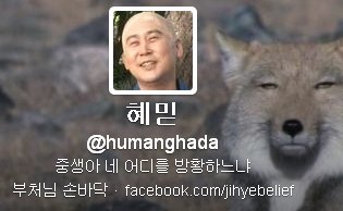 [아시아경제 박충훈 기자] 법명 '혜믿'. 트위터와 페이스북에 올린 촌철살인 메시지로 네티즌의 찬사를 받고 있는 '가상인물'이다. 트위터 계정을 개설한지 3개월만에 팔로어가 2만7000명에 육박한 파워 트위터리안이기도 하다. 각종 온라인 커뮤니티에서는 혜믿스님의 명언을 담은 편집본이 인기다.'허망하다'는 트위터 아이디처럼 혜믿스님은 욕망에 충실하면서도 그 이면에 감춰진 허무함에 대해 설법한다. 욕망과 허망 사이의 줄다리기를 혼자서 해내는 스님의 원맨쇼를 보노라면 웃음이 절로 나온다. 반전 없는 현실이 도리어 반전을 만들어내기도 한다. 예를 들면 이런 식이다. "자본주의는 108번뇌를 돈으로 해결할 수 있다고 속삭입니다. 하지만 포르쉐를 타거나, 대저택에 산다고 해서 번뇌가 해결될까요? 해결됩니다".이런 혜믿스님의 지혜로운 말씀을 자세히 듣고자 직접 인터뷰에 나섰다. 아쉽게도 스님이 계신다는 절 '주말미사(寺)'를 찾을 길 없어 메일 인터뷰로 대신한다. 다음은 스님의 간단한 프로필이다.법명 - 혜믿. 첫사랑 지혜를 못 잊고 그 기억 밑에 있은지가 오래 됐다고 해서 '밑'의 옛말 '믿'을 지혜 '혜(慧)'자에 붙이게 됨.트위터()페이스북()본명, 나이 - 불명.출가 이유 - 이성을 향한 마음을 끊고자.학력 - 런던서당, 스포탠드 대학 학력위조학과.사는 곳 - '목욕관리사(寺)'에서 우회전해서 직진하면 나오는 '기무사'를 끼고 좌회전하면 '일요일엔내가요리사'가 나오는데 그 뒤쪽에 위치한 주말미사.좋아하는 인물 - 포미닛 현아, 첫사랑 지혜.껄끄러운 인물 - 자신을 따라한 혜'밑'스님.