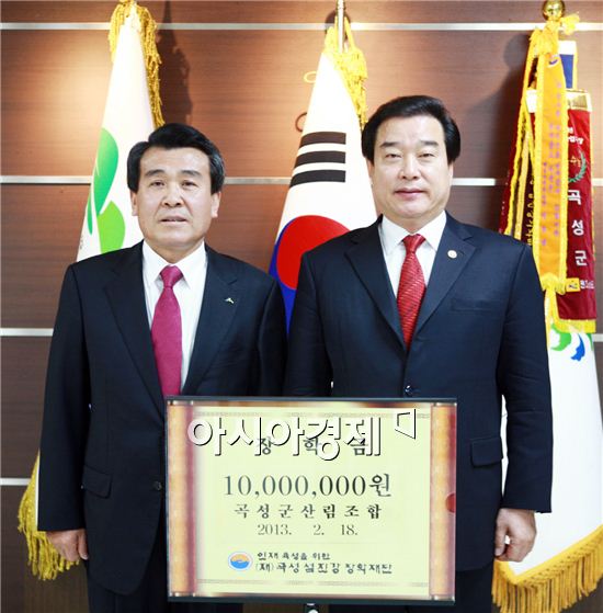 곡성군 산림조합이 곡성섬진강장학재단에 장학금을 기부하고 허남석 곡성군수(오른쪽)와 김종희 산림조합장이 기념촬영을 하고 있다.