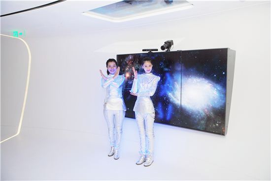 LG하우시스 인조대리석 하이막스(HI-MACS)가 시공된 동방명주 타워 전망대에서 모델들이 포즈를 취하고 있는 모습.