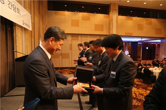서종욱 대우건설 사장(왼쪽)이 19일 서울 밀레니엄호텔에서 개최된 '협력사 동반성장 간담회'에서 협력사 사장들에게 감사패를 전달하고 있다.