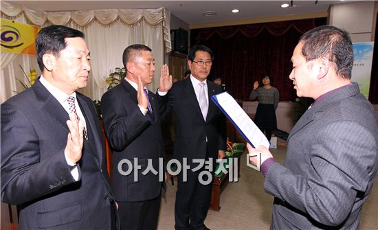 안병호 함평군수가 21일 외식업중앙회 함평군지부 정기총회에서 나트륨 저감화 실천결의문을 받고 있다