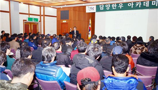 전남 담양군이 명품한우 생산으로 ‘담양 한우’의 경쟁력을 확보하고 한우사육농가의 소득을 증대시키기 위해 실시하고 있는 ‘담양한우 아카데미’가 소 값 하락 등 축산경영여건 악화로 고심을 하고 있는 한우농가에 활력을 불어넣고 있다. 군에 따르면 1월에 이어 지난 22일 문화회관에서 두 번째로 열린 담양한우 아카데미에 관내 한우사육농가 150여명이 참석하는 등 생산성 향상과 고급육 생산기술 등 교육을 받으려는 축산 농가들의 큰 관심 속에 성황을 이루고 있다. 이날 교육은 송아지 설사에 관한 배경지식과 대처요령, 호흡기 질병에 대한 관리법 등 축산현장에서 발생하는 애로사항을 해결할 수 있는 기술위주로 교육이 실시됐다. 아카데미에 참석한 한 농가에서는 “송아지 설사나 호흡기질병 등은 한우를 사육하는 과정에서 자주 직면하는 문제였는데 오늘 교육을 통해 더 건강하게 사육할 수 있을 것 같다”며 소감을 밝혔다. 한편 ‘담양한우 아카데미’는 소 값 하락과 사료 값 상승 등 축산경영여건의 악화로 한우사육농가의 시름이 깊어가고 있는 상황에서 위기를 기회로 삼아 어려운 한우산업의 위기를 극복하기 위해 관내 한우사육농가를 대상으로 농번기인 5월과 10월을 제외하고 매월 1회씩 총 10회에 걸쳐 추진된다. 김재길 기자 <ⓒ세계를 보는 창 경제를 보는 눈, 아시아경제(www.asiae.co.kr) 무단전재 배포금지>