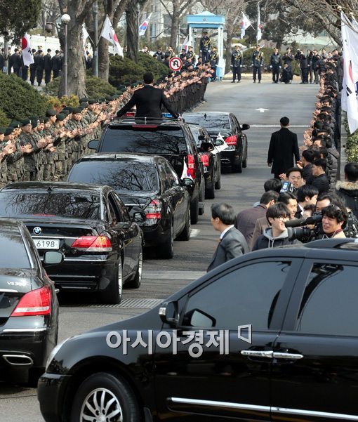 [사진공동취재단] 제18대 대통령 취임식을 마친 박근혜 대통령이 25일 오후 청와대에 입성하며 청와대 직원들과 군장병의 환영을 받고 있다.사진공동취재단<ⓒ세계를 보는 창 경제를 보는 눈, 아시아경제(www.asiae.co.kr) 무단전재 배포금지>