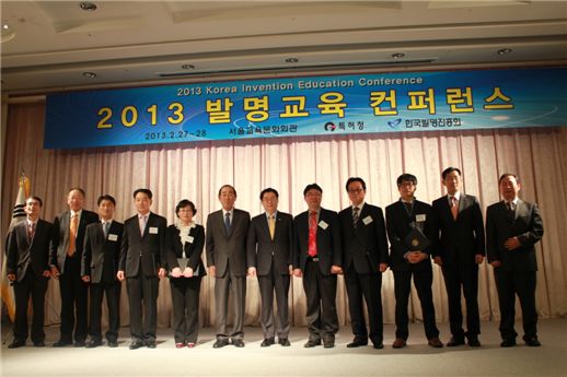 김호원(왼쪽에서 7번째) 특허청장이 배준영 충남기계공업고 교사 등 6명에게 발명교육대상을 준 뒤 윤종용(6번째) 국가지식재산위원장과 수상자들이 기념사진을 찍고 있다.