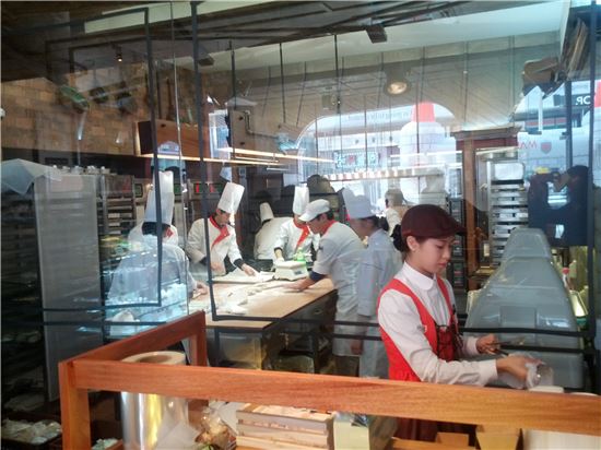 [아시아경제 오주연 기자]"어서오세요, 명장의 마인츠돔입니다."개장 직전까지 사업 진행 여부가 불투명했던 카페베네의 베이커리사업이 27일 강남역에 '마인츠돔'을 개장하며 첫 삽을 떴다. 카페베네는 기존에 드러그스토어 '디셈버24' 강남점이 있던 자리에 카페베네표 베이커리전문점 '마인츠돔 1호' 매장을 냈다. 도로 맞은편에는 SPC그룹의 파리바게뜨와 CJ푸드빌의 뚜레쥬르가 마주보고 있어 강남대로에 3개의 베이커리점이 치열한 경쟁을 벌일 것으로 예상된다. 이날 마인츠돔 매장에는 빵을 구매하려는 고객들이 서로 팔꿈치를 맞댈 정도로 인산인해를 이뤘다. 점심식사 대용으로 샐러드박스를 2개씩 바구니에 담는가하면 진열대에 줄서서 유럽식 제빵을 시식하기도 했다. 빵 종류만 120여가지. 여기에 마카롱, 케이크, 생초콜릿, 쿠키, 사탕 등까지 판매해 선택의 폭을 넓혔다. 가격은 일반 제과점보다는 다소 비싸다. 조각케이크는 4500원에서 5000원대이며 샌드위치는 5000원~6000원, 샐러드 6500원, 크림치즈베이글·카스테라 등은 3000원 수준이다. 음료 종류는 의외로 아이스음료 포함, 20여 종에 그친다.매장 직원은 "커피전문점 카페베네를 운영하고 있어 굳이 마인츠돔에서까지 음료를 팔 필요는 없다고 봤다"며 "음료 판매로 행여 다른 제과점에 피해를 주는 것은 김선권 대표가 원치 않아 해서 구색 맞추는 정도로만 최소화했다"고 말했다.무엇보다 마인츠돔의 가장 큰 특징은 공개주방이다. 제과점에 웬 주방일까. 카페베네는 이탈리안 레스토랑 블랙스미스에서 선보인 오픈키친을 베이커리매장에도 한껏 살려 일반 제과점과 차별화를 뒀다.▲마인츠돔의 가장 큰 특징은 공개주방. 블랙스미스에서 선보인 오픈키친을 베이커리매장에도 한껏 살려 일반 제과점과 차별화를 뒀다.