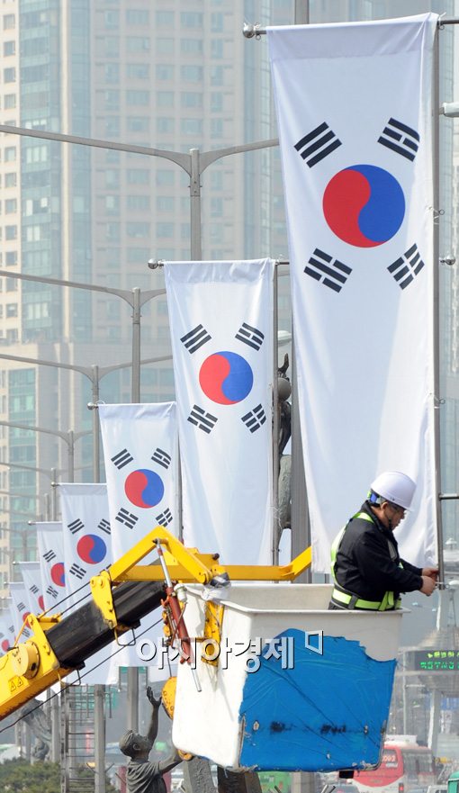 [아시아경제 백소아 기자] 3·1절을 하루 앞둔 28일 서울 송파구 올릭픽로 중앙분리대에서 한 관계자가 태극기를 달고 있다.백소아 기자 sharp2046@<ⓒ세계를 보는 창 경제를 보는 눈, 아시아경제(www.asiae.co.kr) 무단전재 배포금지>
