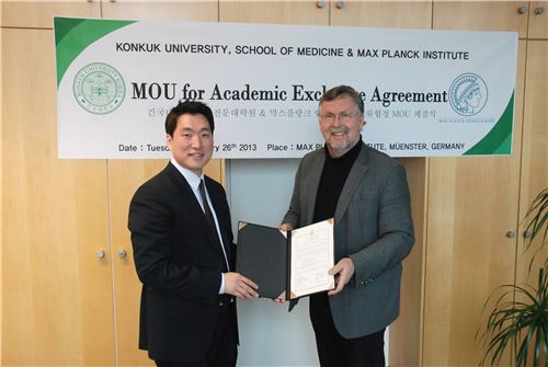 한동욱 건국대 의학전문대학원 줄기세포교실 교수(왼쪽)와 한스 쉘러 독일 막스플랑크연구소 교수(오른쪽)가 공동연구 협약을 체결한 후 기념촬영을 하고 있다. [사진제공= 건국대학교 의학전문대학원]<br />