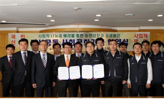 권진봉 한국감정원장(가운데 왼쪽)과 구종서 전국금융산업노동조합 한국감정원지부 위원장(가운데 오른쪽) 등은 지난 5일 한국감정원 삼성동 본사에서 노사공동 사회공헌기금 조성에 합의했다.
