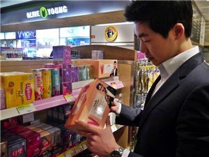 ▲화이트데이를 앞두고 남성 소비자가 CJ올리브영에서 먹는 화장품 이너비를 살펴보고 있다.