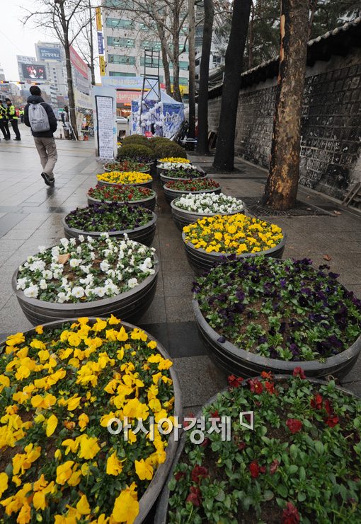 [아시아경제 백소아 기자] 화재가 발생했던 서울 덕수궁 대한문 앞 쌍용자동차 해고노동자 천막농성장 자리에 7일 서울 중구가 설치한 대형 화분이 놓여있다. 까맣게 타버린 덕수궁 돌담길과 형형색색의 화분들이 대조를 이루고 있다.백소아 기자 sharp2046@<ⓒ세계를 보는 창 경제를 보는 눈, 아시아경제(www.asiae.co.kr) 무단전재 배포금지>