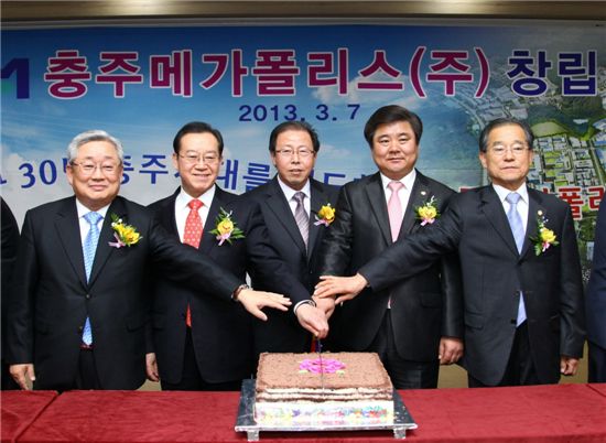 충주메가폴리스(주) 창립 축하 떡을 자르고 있는 내빈들
