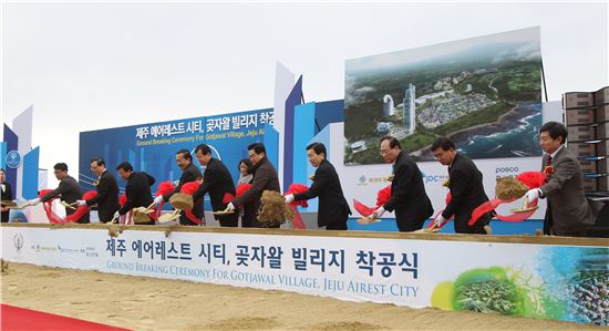 ▲7일 오전 제주 예래동 '제주 에어레스트시티' 곶자왈 빌리지 사업부지에서 열린 착공식에서 탄 쓰리 빈센트 탄 버자야그룹 회장(왼쪽 네번째)과 한만희 국토부 1치관 등이 시삽을 하고 있다.
