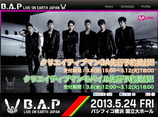 [아시아경제 이금준 기자]남성그룹 B.A.P가 일본에서 데뷔 전 콘서트를 갖는다. B.A.P의 소속사인 TS엔터테인먼트는 8일 "B.A.P가 오는 5월 24일 일본 파시피코 요코하마 국립대 홀에서 5천 석 규모의 첫 단독 콘서트 'B.A.P LIVE ON EARTH JAPAN'을 개최하며 2013년에도 파격적인 행보를 이어 나간다"고 밝혔다. B.A.P 콘서트 주최 측인 크리에이티브맨의 관계자는 "어제 오후 12시 홈페이지에 콘서트 관련 공지만 게재했을 뿐인데 문의전화가 폭주하고 있으며 서버가 마비되는 등 일본 팬들의 열광적인 반응이 벌써부터 시작됐다"고 말했다.이와 함께 일본 최대의 사이트인 오리콘, 빌보드재팬, 야후재팬 등을 비롯, 일본의 최대 한류 전문 사이트인 kstyle에서 한국의 신인상을 독식한 B.A.P의 일본 첫 단독 콘서트 개최를 앞 다퉈 보도하는 등 일본 언론과 팬들의 뜨거운 관심을 받고 있다. B.A.P는 '2012 J-pop Asia Music Awards'에서 신인상을 수상한 바 있으며, 지난달에는 'B.A.P LIVE ON EARTH SEOUL' 공연을 보기 위해 500여 명의 일본 팬이 한국을 찾는 등 인기를 과시했다.이금준 기자 music@<ⓒ아시아경제 & 스투닷컴(stoo.com)이 만드는 온오프라인 연예뉴스>