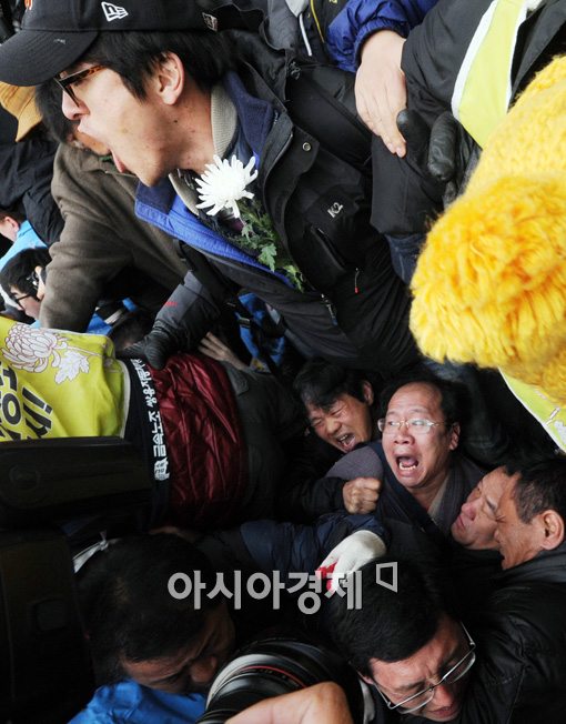 [아시아경제 백소아 기자] 서울 중구청이 1년 여간 농성을 벌여온 쌍용자동차 해고자들의 농성촌 강제철거 집행을 예고한 8일 서울 덕수궁 대한문 앞에서 중구청 직원들과 쌍용자동차 해고노동자들이 충돌하고 있다.백소아 기자 sharp2046@<ⓒ세계를 보는 창 경제를 보는 눈, 아시아경제(www.asiae.co.kr) 무단전재 배포금지>