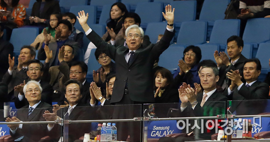 [아시아경제 정재훈 기자] 15일 오후 서울 잠실실내체육관에서 열린 'KB 국민카드 2012~2013 프로농구' 서울 삼성 썬더스와 전주 KCC 이지스의 경기를 찾은 문용린 서울시 교육감이 관중들을 향해 인사하고 있다.정재훈 기자 roze@<ⓒ세계를 보는 창 경제를 보는 눈, 아시아경제(www.asiae.co.kr) 무단전재 배포금지>