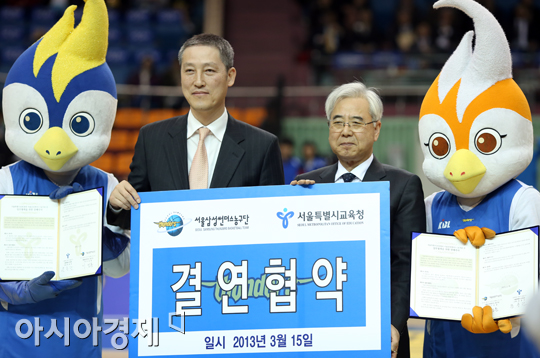 [아시아경제 정재훈 기자] 15일 오후 서울 잠실실내체육관에서 열린 'KB 국민카드 2012~2013 프로농구' 서울 삼성 썬더스와 전주 KCC 이지스의 경기. 서울교육청과 삼성 썬더스가 스포츠 친화적 학교문화 조성에 협력하는 업무협약(MOU)을 맺었다. 삼성 썬더스 이성훈 단장과 문용린 서울시교육감이 기념촬영을 하고 있다.정재훈 기자 roze@<ⓒ세계를 보는 창 경제를 보는 눈, 아시아경제(www.asiae.co.kr) 무단전재 배포금지>