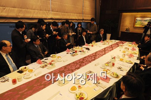 [아시아경제 백소아 기자] 김중수 한국은행 총재가 20일 서울 중구 한국은행 본점에서 열린 경제동향간담회에서 참석인사들과 이야기를 나누고 있다. 이날 김총재는 통화정책을 결정할 때는 주요국의 기준금리 흐름을 봐야한다고 말했다.백소아 기자 sharp2046@<ⓒ세계를 보는 창 경제를 보는 눈, 아시아경제(www.asiae.co.kr) 무단전재 배포금지>