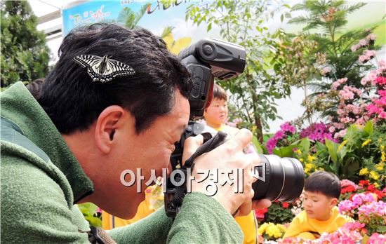 전남 함평군(군수 안병호)이 춘분인 20일 함평읍 함평엑스포공원 나비곤충생태관에서 제15회 함평나비대축제 성공개최를 바라는 나비날리기 행사를 가졌다.이날 행사에 참석한 안병호 함평군수, 양규모 군의회의장과 군의원, 각 기관사회단체장과 삼애어린이집 어린이 등 100여 명은 2013마리의 나비를 날리며 축제가 성공적으로 개최되길 기원했다.함평군은 ‘나비와 함께 행복한 세상’이라는 주제로 오는 4월26일부터 5월8일까지 13일간 함평엑스포공원에서 제15회 함평나비대축제를 개최하고 꽃과 나비, 곤충을 소재로 한 다양한 전시·체험행사를 선보일 예정이다.나비 날리기 취재 중인 사진기자 머리에 호랑나비가 앉아있다.노해섭 기자 nogary@<ⓒ세계를 보는 창 경제를 보는 눈, 아시아경제(www.asiae.co.kr) 무단전재 배포금지>