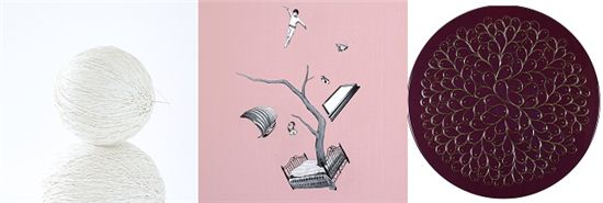 (왼쪽부터)김시연, Thread(실타래), 디지털 프린트, 100x 100cm, 2011(에디션 1/5), <br /> 정규리, A time tree, oil on canvas, 60x 60cm, 2012,<br /> 함연주, blooming, mixed media, 지름 50cm, 2013.<br /> <br /> <br />