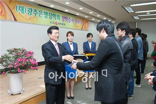 재단법인 광주은행장학회는 25일 광주은행 본점 3층 대회의실에서 임직원들과 광은 장학생 등이 참석한 가운데 ‘2013년 광은장학회 장학증서 수여식’을 가졌다.이에 따라 송기진 광주은행장학회 이사장은 이날 37개 지역 대학과 자치단체 등에서 추천 받은 대학생 가운데 학업성적이 우수하고 품행이 단정한 77명을 선정, 1억5000여만원의 장학금을 전달하고 격려했다.이 자리에서 송 이사장은 “광주은행 장학생으로서의 긍지와 자부심을 갖고 우리 지역을 이끌어 나갈 핵심 인재로 성장해 주길 바란다”고 당부했다.광주은행은 1981년 11월 재단법인 광주은행 장학회를 설립, 지난 32년간 3516명의 지역 학생들에게 25억원 상당의 장학금을 지급하는 등 명실상부한 지역 장학사업의 산실이라는 평가를 받고 있다.광주은행 사회공헌사무국 김준원 본부장은 “광주은행은 앞으로도 장학사업을 꾸준히 전개하는 동시에 지역인재 채용확대, 광은 인턴제도, 대학생 홍보대사 선발 등 여러 채널을 통해 청년 일자리 창출과 함께 다양한 사회공헌활동을 통한 기업의 사회적 책임에도 앞장 설 계획”이라고 밝혔다.정선규 기자 sun@<ⓒ세계를 보는 창 경제를 보는 눈, 아시아경제(www.asiae.co.kr) 무단전재 배포금지>