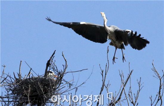 꽃샘추위가 이어진 25일 면(面) 전체가 친환경농업지역인 전남 강진군 옴천면 마을 뒷산에 자리를 잡은 왜가리가 보금자리를 단장하느라 부산하다.왜가리의 둥지단장은 암컷은 둥지를 지키고 수컷은 나뭇가지를 물어 나르는 분업으로 완성되는데 이곳에서 4월 초순부터 알을 낳기 시작해 5월 중순이 지나면 부화된 새끼들과 함께 생활하게 된다. 사진제공=강진군노해섭 기자 nogary@<ⓒ세계를 보는 창 경제를 보는 눈, 아시아경제(www.asiae.co.kr) 무단전재 배포금지>