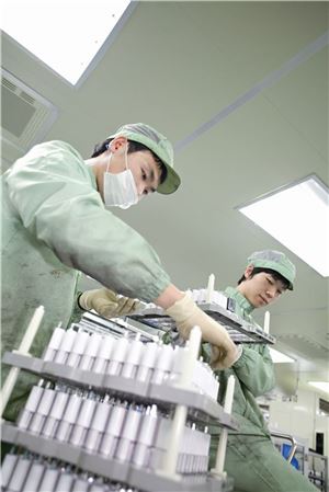 ▲삼성SDI 천안사업장에서 제조라인 직원들이 2차전지 제품을 살펴보고 있다.