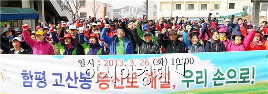 26일 함평군 대동면사무소앞에서 열린 고산봉 등산로개설 출정식에 참석한 주민들이 파이팅을 외치고 있다