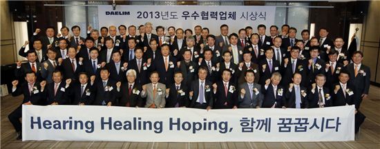 27일 서울 조선호텔에서 열린 대림산업 2013 우수협력업체 시상식에서 김윤 부회장과 임직원 및 협력업체 관계자들이 상생협력을 다짐하는 의미로 손을 맞잡은 채 기념촬영을 하고 있다.