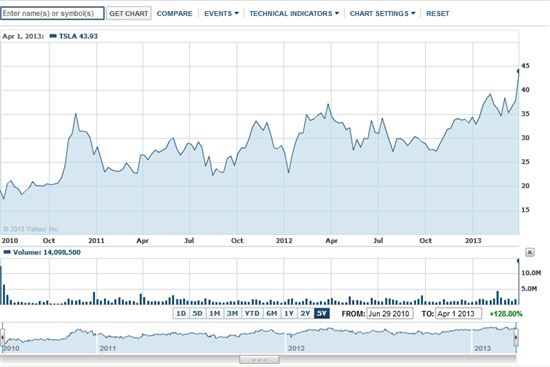 테슬라 모터스 주가 추이[출처: 야후 파이낸스]