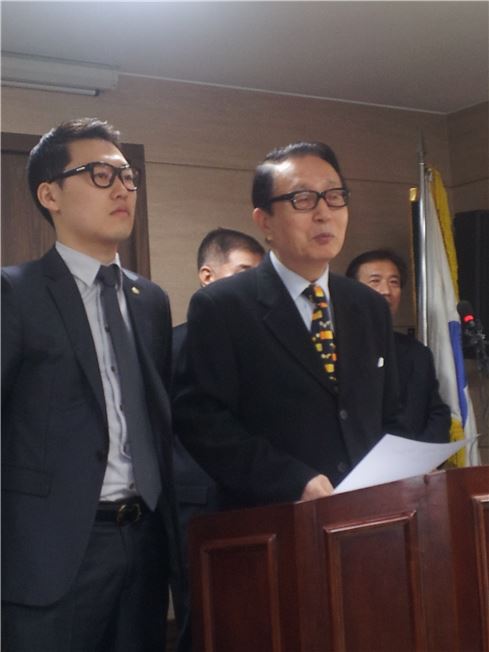 박찬종 법무법인 한우리 변호사(오른쪽)가 8일 서부이촌동 새마을금고 3층 회의실에서 열린 손해배상 청구소송 무료 변론 관련한 기자회견에서 소송의 취지를 설명하고 있다.