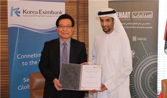 한국수출입은행은 지난 8일(한국시간) 에미리트스틸의 국영 지주회사인 GHC와 한국기업의 수주를 돕기 위한 업무협약(MOU)을 체결했다. 사진은 왼쪽부터 설영환 수출입은행 선임부행장, 자셈 부사이베 GHC 재무담당 이사.