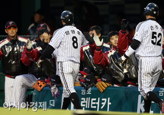 [아시아경제 정재훈 기자] 10일 오후 서울 잠실야구장에서 열린 '2013 한국야쿠르트 세븐프로야구' LG 트윈스와 NC 다이노스의 경기. 2회말 2사 만루 상황에서 조윤준의 2타점 적시타에 2,3루 주자 양영동, 손주인이 홈인하고 있다. 정재훈 기자 roze@<ⓒ세계를 보는 창 경제를 보는 눈, 아시아경제(www.asiae.co.kr) 무단전재 배포금지>