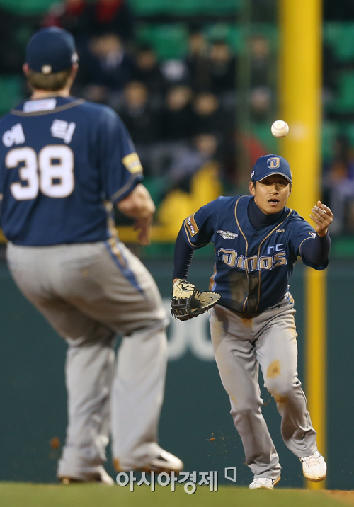 [아시아경제 정재훈 기자] 10일 오후 서울 잠실야구장에서 열린 '2013 한국야쿠르트 세븐프로야구' LG 트윈스와 NC 다이노스의 경기. 2회말 2사 2루 상황에서 이진영의 타구를 잡은 차화준이 1루로 달리는 에릭에게 공을 건네고 있다. 정재훈 기자 roze@<ⓒ세계를 보는 창 경제를 보는 눈, 아시아경제(www.asiae.co.kr) 무단전재 배포금지>